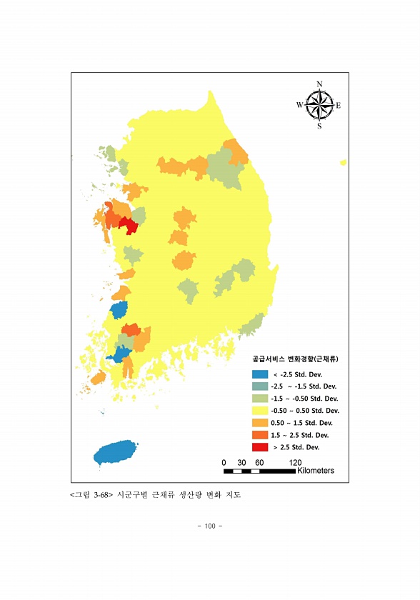 100 그림 3-68 시군구별 근채류 생산량 변화지도