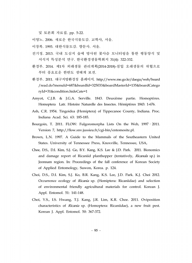 95 및 토론회 자료집. pp. 5-22. 이영노. 2006. 새로운 한국식물도감. 교학사, 서울. 이창복. 1993. 대한식물도감. 향문사. 서울. 진기정. 2013. 국내 도심지 숲에 방사된 꽃사슴 모니터링을 통한 행동양식 및 서식지 특성분석 연구. 한국환경생물학회지 31 4 322-332. 환경부. 2014. 제1차 외래생물 관리계획 2014-2018 -침입 오래생물의 위협으로 부터 풍요로운 한반도 생태계 보전. 환경부. 2011. 대구지방환경청 홈페이지. http//www.me.go.kr/daegu/web/board /read.do?menuId=687&boardId=325033&boardMasterId=135&boardCatego ryId=31&condition.hideCate=1 Amyot, C.J...