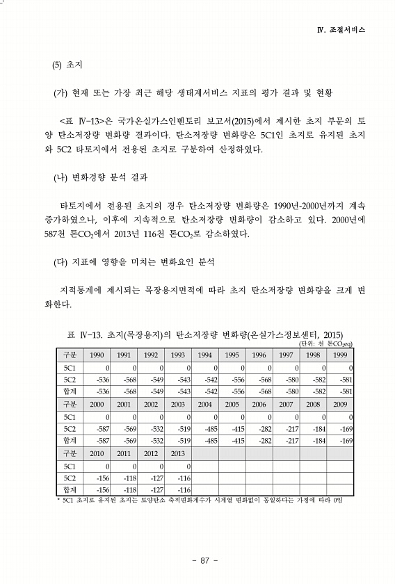 Ⅳ. 조절서비스 87 5 초지 가 현재 또는 가장 최근 해당 생태계서비스 지표의 평가 결과 및 현황 표 Ⅳ 13 은 국가온실가스인벤토리 보고서 2015 에서 제시한 초지 부문의 토 양 탄소저장량 변화량 결과이다. 탄소저장량 변화량은 5C1인 초지로 유지된 초지 와 5C2 타토지에서 전용된 초지로 구분하여 산정하였다. 나 변화경향 분석 결과 타토지에서 전용된 초지의 경우 탄소저장량 변화량은 1990년-2000년까지 계속 증가하였으나, 이후에 지속적으로 탄소저장량 변화량이 감소하고 있다. 2000년에 587천 톤CO2에서 2013년 116천 톤CO2로 감소하였다. 다 지표에 영향을 미치는 변화요인 분석 지적통계에 제시되는 목장용지면적에 따라 초지 탄소저장량 변화량을 크게 변 화한다. 단위천 톤CO2eq 구분 1...