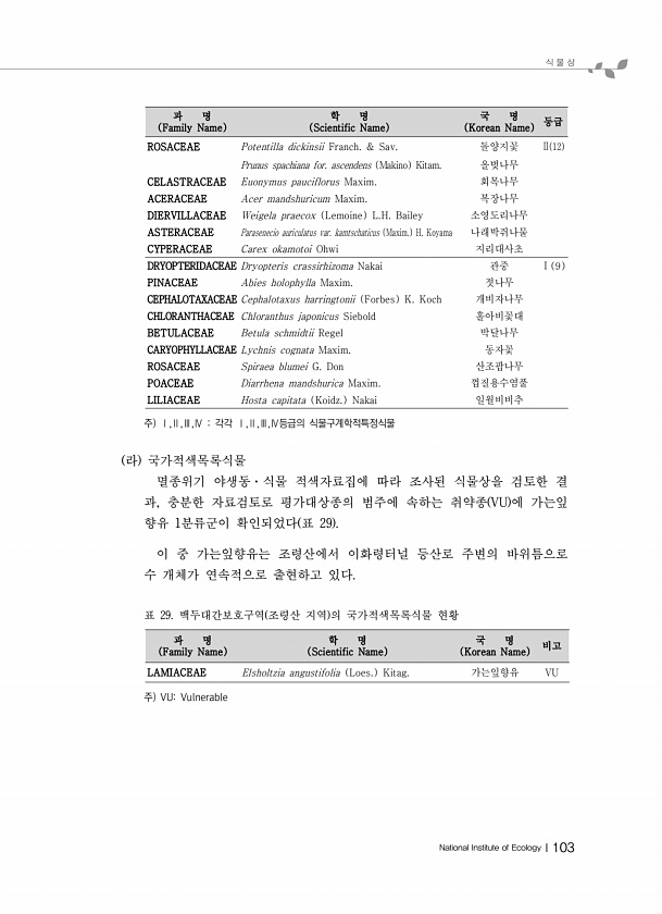 식 물 상 National Institute of EcologyⅠ103 과 명 Family Name 학 명 Scientific Name 국 명 Korean Name 등급 ROSACEAE Potentilla dickinsii Franch. & Sav. 돌양지꽃 Ⅱ 12 Prunus spachiana for. ascendens Makino Kitam. 올벚나무 CELASTRACEAE Euonymus pauciflorus Maxim. 회목나무 ACERACEAE Acer mandshuricum Maxim. 복장나무 DIERVILLACEAE Weigela praecox Lemoine L.H. Bailey 소영도리나무 ASTERACEAE Parasenecio auriculatus var. kamtschaticus Ma...