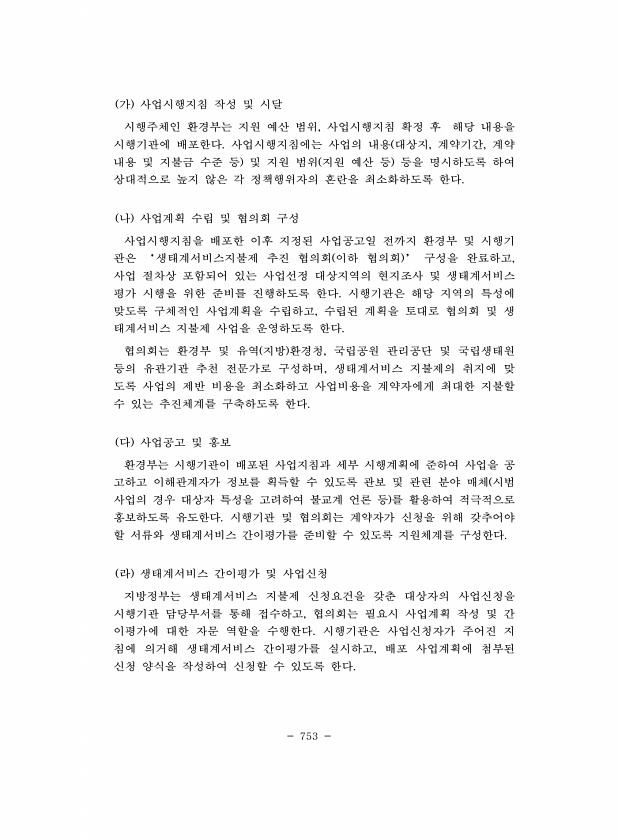 753 가 사업시행지침 작성 및 시달 시행주체인 환경부는 지원 예산 범위, 사업시행지침 확정 후 해당 내용을 시행기관에 배포한다. 사업시행지침에는 사업의 내용 대상지, 계약기간, 계약 내용 및 지불금 수준 등 및 지원 범위 지원 예산 등 등을 명시하도록 하여 상대적으로 높지 않은 각 정책행위자의 혼란을 최소화하도록 한다. 나 사업계획 수립 및 협의회 구성 사업시행지침을 배포한 이후 지정된 사업공고일 전까지 환경부 및 시행기 관은 ‘생태계서비스지불제 추진 협의회 이하 협의회 ’ 구성을 완료하고, 사업 절차상 포함되어 있는 사업선정 대상지역의 현지조사 및 생태계서비스 평가 시행을 위한 준비를 진행하도록 한다. 시행기관은 해당 지역의 특성에 맞도록 구체적인 사업계획을 수립하고, 수립된 계획을 토대로 협의회 및 생...
