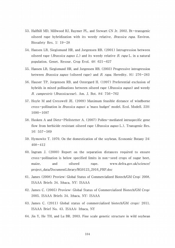 104 53. Halfhill MD, Millwood RJ, Raymer PL, and Stewart CN Jr. 2002. Bt-transgenic oilseed rape hybridization with its weedy relative, Brassica rapa. Environ. Biosafety Res. 119-28 54. Hansen LB, Siegismund HR, and Jorgensen RB. 2001 Introgression between oilseed rape Brassica napus L. and its weedy relative B. rapa L. in a natural population. Genet. Resour. Crop Evol. 48621-627 55. Hansen LB, Si...