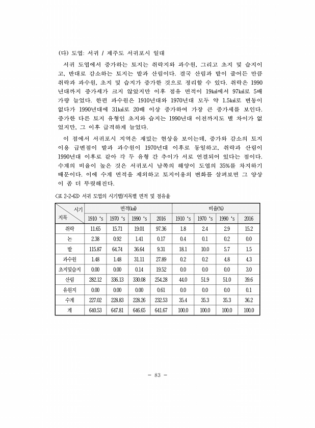 83 다 도엽서귀 제주도 서귀포시 일대 서귀 도엽에서 증가하는 토지는 취락지와 과수원, 그리고 초지 및 습지이 고, 반대로 감소하는 토지는 밭과 산림이다. 결국 산림과 밭이 줄어든 만큼 취락과 과수원, 초지 및 습지가 증가한 것으로 정리할 수 있다. 취락은 1990 년대까지 증가세가 크지 않았지만 이후 점유 면적이 19㎢에서 97㎢로 5배 가량 늘었다. 한편 과수원은 1910년대와 1970년대 모두 약 1.5㎢로 변동이 없다가 1990년대에 31㎢로 20배 이상 증가하여 가장 큰 증가세를 보인다. 증가한 다른 토지 유형인 초지와 습지는 1990년대 이전까지도 별 차이가 없 었지만, 그 이후 급격하게 늘었다. 이 점에서 서귀포시 지역은 재밌는 현상을 보이는데, 증가와 감소의 토지 이용 급변점이 밭과 과수원이 ...