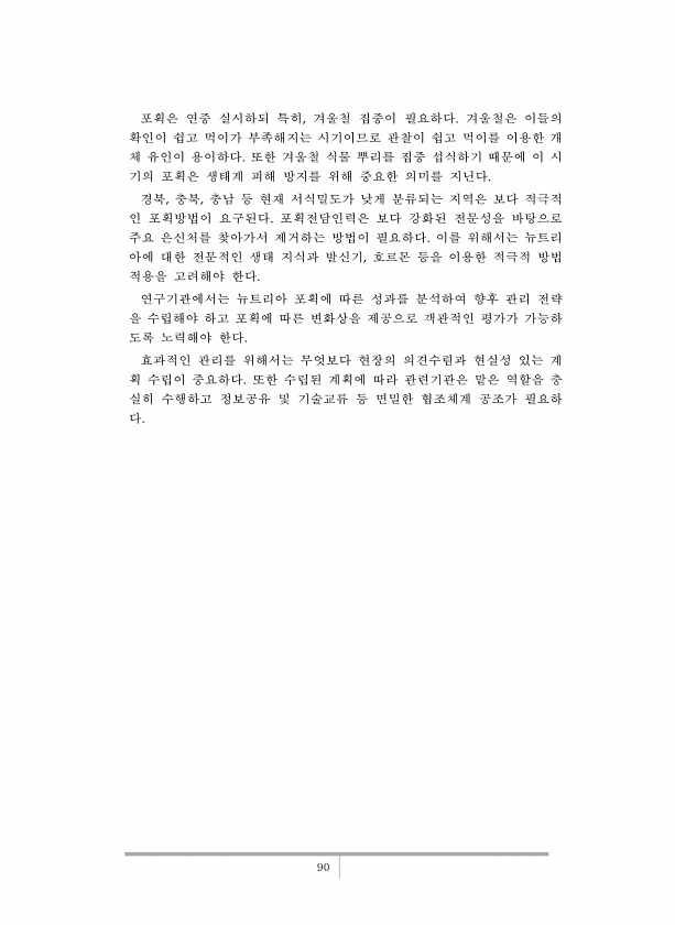 90 포획은 연중 실시하되 특히, 겨울철 집중이 필요하다. 겨울철은 이들의 확인이 쉽고 먹이가 부족해지는 시기이므로 관찰이 쉽고 먹이를 이용한 개 체 유인이 용이하다. 또한 겨울철 식물 뿌리를 집중 섭식하기 때문에 이 시 기의 포획은 생태계 피해 방지를 위해 중요한 의미를 지닌다. 경북, 충북, 충남 등 현재 서식밀도가 낮게 분류되는 지역은 보다 적극적 인 포획방법이 요구된다. 포획전담인력은 보다 강화된 전문성을 바탕으로 주요 은신처를 찾아가서 제거하는 방법이 필요하다. 이를 위해서는 뉴트리 아에 대한 전문적인 생태 지식과 발신기, 호르몬 등을 이용한 적극적 방법 적용을 고려해야 한다. 연구기관에서는 뉴트리아 포획에 따른 성과를 분석하여 향후 관리 전략 을 수립해야 하고 포획에 따른 변화상을 제공으로 객관적...