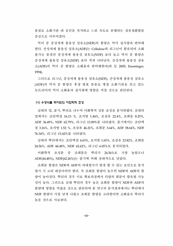 -88- 물질로 소화기관 내 공간을 차지하고 느린 속도로 분해되는 섬유질화합물 중심으로 이루어졌다. 먹이 중 중성세제 불용성 섬유소 NDF 의 함량은 먹이 섭식량과 반비례 한다. 산성세제 불용성 섬유소 ADF 는 Cellulose와 리그닌이 함유되어 소화 불가능 물질인 중성세제 불용성 섬유소 NDF 보다 높고 먹이 중 함량은 중성세제 불용성 섬유소 NDF 보다 적게 나타난다. 산성세제 불용성 섬유 소 ADF 의 먹이 중 함량은 소화율과 반비례한다 하 등 2005; Ensminger, 1994 그러므로 리그닌, 중성세제 불용성 섬유소 NDF , 산성세제 불용성 섬유소 ADF 의 먹이 중 함량은 후장 발효 동물로 맹장 소화기관을 갖고 있는 뉴트리아의 먹이 소화율과 섭식량에 영향을 끼칠 것으로 판단된다. 나 수생...