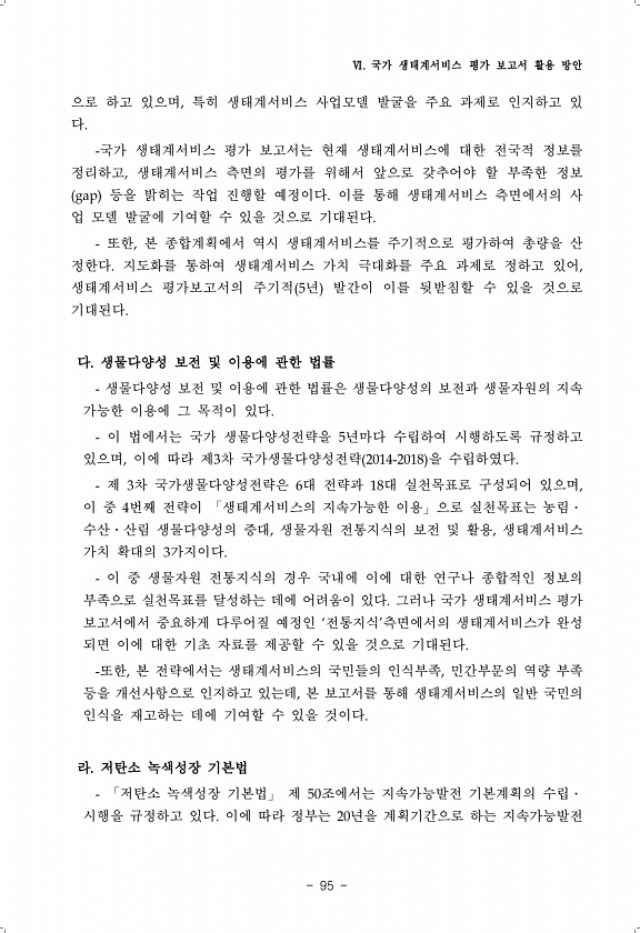 Ⅵ. 국가 생태계서비스 평가 보고서 활용 방안 95 으로 하고 있으며, 특히 생태계서비스 사업모델 발굴을 주요 과제로 인지하고 있 다. -국가 생태계서비스 평가 보고서는 현재 생태계서비스에 대한 전국적 정보를 정리하고, 생태계서비스 측면의 평가를 위해서 앞으로 갖추어야 할 부족한 정보 gap 등을 밝히는 작업 진행할 예정이다. 이를 통해 생태계서비스 측면에서의 사 업 모델 발굴에 기여할 수 있을 것으로 기대된다. 또한, 본 종합계획에서 역시 생태계서비스를 주기적으로 평가하여 총량을 산 정한다. 지도화를 통하여 생태계서비스 가치 극대화를 주요 과제로 정하고 있어, 생태계서비스 평가보고서의 주기적 5년 발간이 이를 뒷받침할 수 있을 것으로 기대된다. 다. 생물다양성 보전 및 이용에 관한 법률 생물다양성 보전 및...