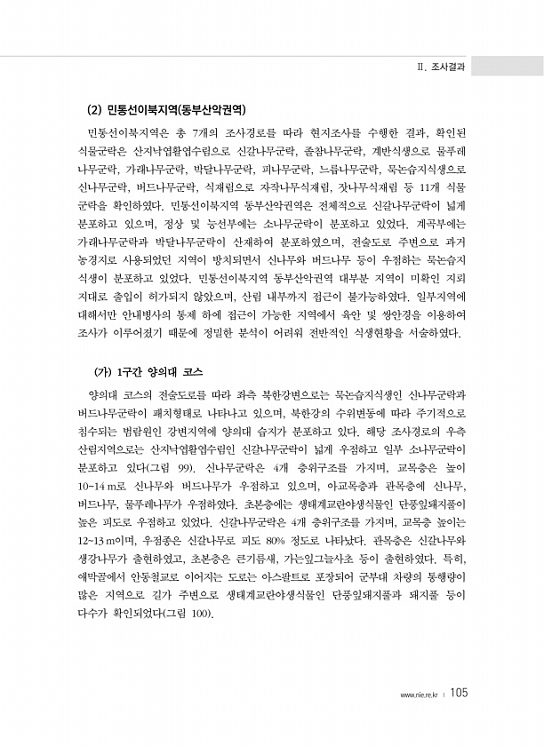 Ⅱ. 조사결과 www.nie.re.kr ? 105 2 민통선이북지역 동부산악권역 민통선이북지역은 총 7개의 조사경로를 따라 현지조사를 수행한 결과, 확인된 식물군락은 산지낙엽활엽수림으로 신갈나무군락, 졸참나무군락, 계반식생으로 물푸레 나무군락, 가래나무군락, 박달나무군락, 피나무군락, 느릅나무군락, 묵논습지식생으로 신나무군락, 버드나무군락, 식재림으로 자작나무식재림, 잣나무식재림 등 11개 식물 군락을 확인하였다. 민통선이북지역 동부산악권역은 전체적으로 신갈나무군락이 넓게 분포하고 있으며, 정상 및 능선부에는 소나무군락이 분포하고 있었다. 계곡부에는 가래나무군락과 박달나무군락이 산재하여 분포하였으며, 전술도로 주변으로 과거 농경지로 사용되었던 지역이 방치되면서 신나무와 버드나무 등이 우점하는 묵논습지 식생이...