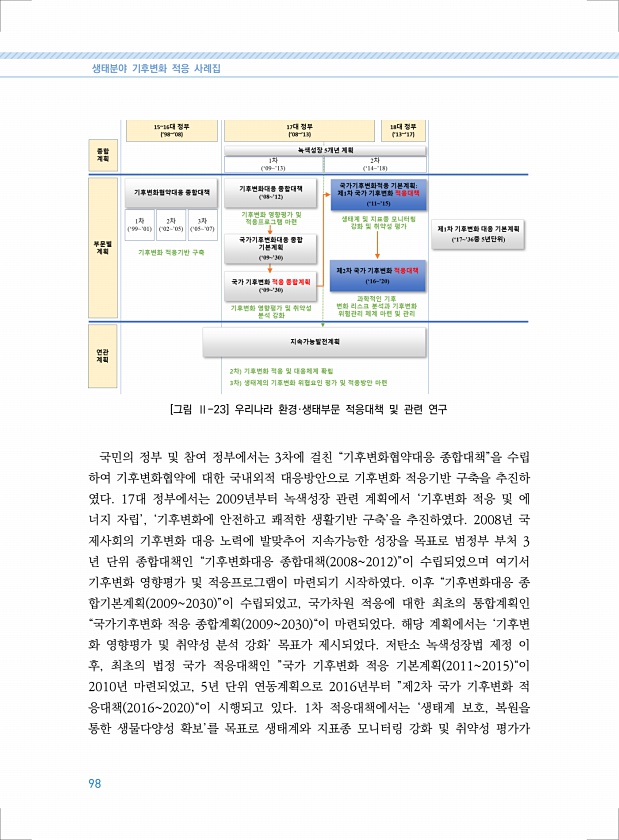 생태분야 기후변화 적응 사례집 98 [그림 Ⅱ-23] 우리나라 환경·생태부문 적응대책 및 관련 연구 국민의 정부 및 참여 정부에서는 3차에 걸친 “기후변화협약대응 종합대책”을 수립 하여 기후변화협약에 대한 국내외적 대응방안으로 기후변화 적응기반 구축을 추진하 였다. 17대 정부에서는 2009년부터 녹색성장 관련 계획에서 ‘기후변화 적응 및 에 너지 자립’, ‘기후변화에 안전하고 쾌적한 생활기반 구축’을 추진하였다. 2008년 국 제사회의 기후변화 대응 노력에 발맞추어 지속가능한 성장을 목표로 범정부 부처 3 년 단위 종합대책인 “기후변화대응 종합대책 20082012 ”이 수립되었으며 여기서 기후변화 영향평가 및 적응프로그램이 마련되기 시작하였다. 이후 “기후변화대응 종 합기본계획 20092030 ”이 수립되...