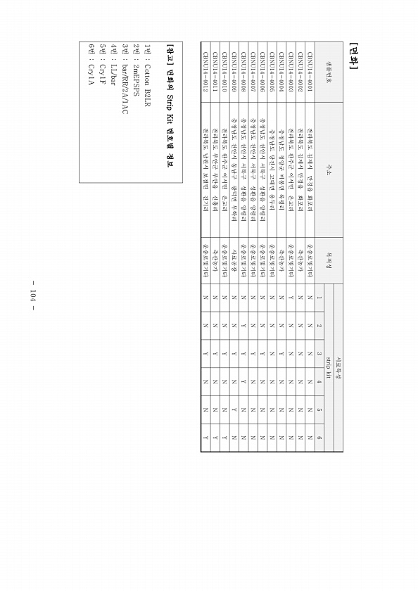 104 샘플번호 주소 목적성 시료특성 strip kit 1 2 3 4 5 6 CBNU14-4001 전라북도 김제시 만경읍 화포리 운송로및기타 N N N N N N CBNU14-4002 전라북도 김제시 만경읍 화포리 축산농가 N N N N N N CBNU14-4003 전라북도 완주군 이서면 은교리 운송로및기타 Y N N N N N CBNU14-4004 충청남도 청양군 비봉면 록평리 축산농가 N N Y N N N CBNU14-4005 충청남도 당진시 고대면 용두리 운송로및기타 N N N N N N CBNU14-4006 충청남도 천안시 서북구 성환읍 양령리 운송로및기타 N N Y N N N CBNU14-4007 충청남도 천안시 서북구 성환읍 양령리 운송로및기타 N N Y N N N CBNU14-4008 충청남도 ...