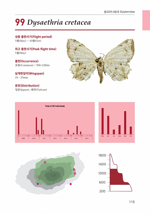 Palpita nigropunctalis 115 쌍꼬리나방과 Epiplemidae 성충 출현시기 Flight period 5월 May 10월 Oct 최고 출현시기 Peak fight time 5월 May 출현 Occurrence 보통 Common 500-1200m 날개편길이 Wingspan 19 25mm 분포 Distribution 일본 Japan , 대만 Taiwan 99 Dysaethria cretacea M J J A S O M J J A S O M J J A S O M J J A S O M J J A S O M J J A S O M J J A S O May Jun Jul Aug Sep Oct 2009 2010 2011 2012 2013 2014 2015 Total of 58individuals