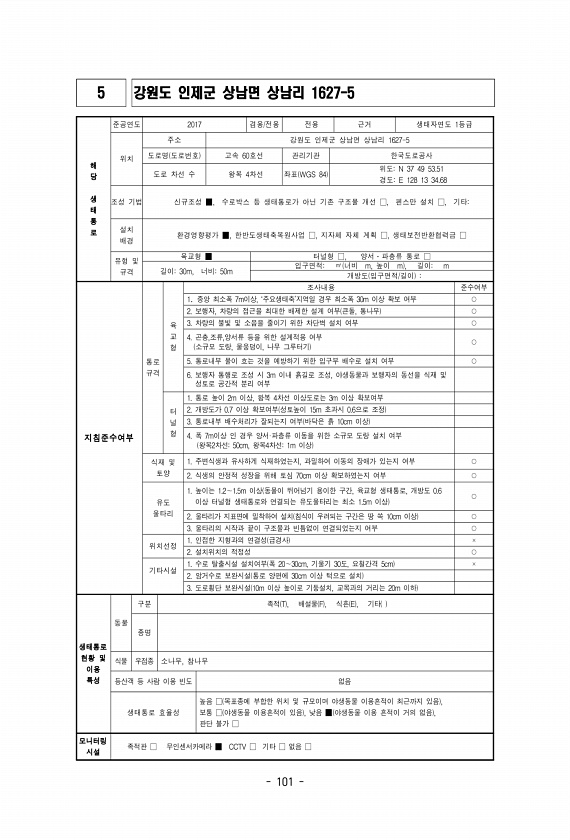 101 5 강원도 인제군 상남면 상남리 1627-5 해 당 생 태 통 로 준공연도 2017 겸용/전용 전용 근거 생태자연도 1등급 위치 주소 강원도 인제군 상남면 상남리 1627-5 도로명 도로번호 고속 60호선 관리기관 한국도로공사 도로 차선 수 왕복 4차선 좌표 WGS 84 위도N 37 49 53.51 경도E 128 13 34.68 조성 기법 신규조성 ■, 수로박스 등 생태통로가 아닌 기존 구조물 개선 □, 펜스만 설치 □, 기타설치 배경 환경영향평가 ■, 한반도생태축복원사업 □, 지자체 자체 계획 □, 생태보전반환협력금 □ 유형 및 규격 육교형 ■ 터널형 □, 양서?파충류 통로 □ 길이30m, 너비50m 입구면적㎡ 너비 m, 높이 m , 길이m 개방도 입구면적/길이 지침준수여부 통로 규격 육 교 형 조...