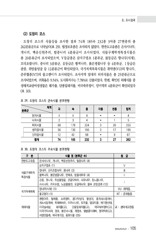 Ⅱ. 조사결과 www.nie.re.kr ? 105 2 도창리 코스 도창리 코스의 식물상을 조사한 결과 74과 185속 232종 3아종 27변종의 총 262분류군으로 나타났다 표 29 법정보호종은 조사되지 않았다. 한반도고유종은 은사시나무, 개나리, 백운산원추리, 털중나리 4분류군이 조사되었다. 식물구계학적특정식물은 총 20분류군이 조사되었으며, Ⅴ등급종은 삼지구엽초 1분류군, Ⅲ등급은 향나무 식재 , 꼬리조팝나무, 중나리 3분류군, Ⅱ등급은 황벽나무, 붉은병꽃나무 등 4분류군, Ⅰ등급은 관중, 쥐방울덩굴 등 12분류군이 확인되었다. 국가적색목록식물은 취약종 VU 의 향나무, 준위협종 NT 의 물고랭이가 조사되었다. 조사지역 일대의 외래식물은 총 25분류군으로 조사되었으며, 귀화율은 9.54%, 도시화지수는 ...