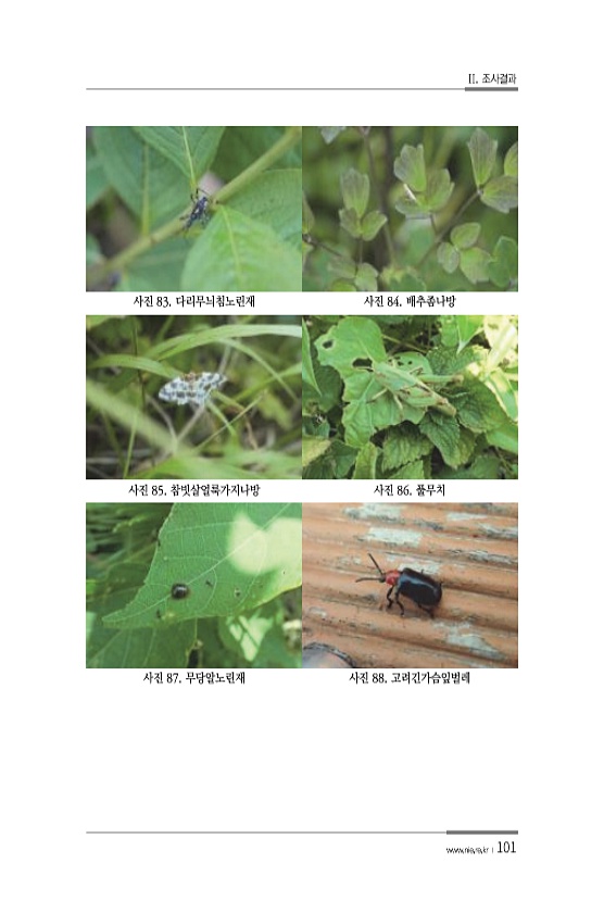 II. 조사결과 www.nie.re.kr ?101 사진 83. 다리무늬침노린재 사진 84. 배추좀나방 사진 85. 참빗살얼룩가지나방 사진 86. 풀무치 사진 87. 무당알노린재 사진 88.고려긴가슴잎벌레
