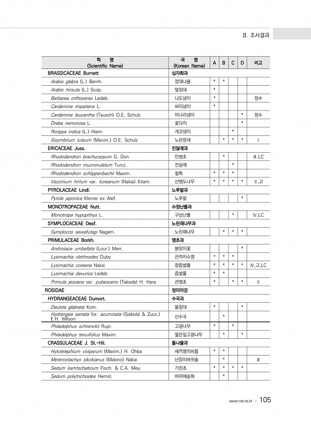 Ⅱ. 조사결과 www.nie.re.kr ? 105 학 명 Scientific Name 국 명 Korean Name A B C D 비고 BRASSICACEAE Burnett 십자화과 Arabis glabra L. Bernh. 장대나물 * * Arabis hirsuta L. Scop. 털장대 * Barbarea orthoceras Ledeb. 나도냉이 * 정수 Cardamine impatiens L. 싸리냉이 * Cardamine leucantha Tausch O.E. Schulz 미나리냉이 * 정수 Draba nemorosa L. 꽃다지 * Rorippa indica L. Hiern 개갓냉이 * Sisymbrium luteum Maxim. O.E. Schulz 노란장대 * * * Ⅰ ERICACEAE Juss...