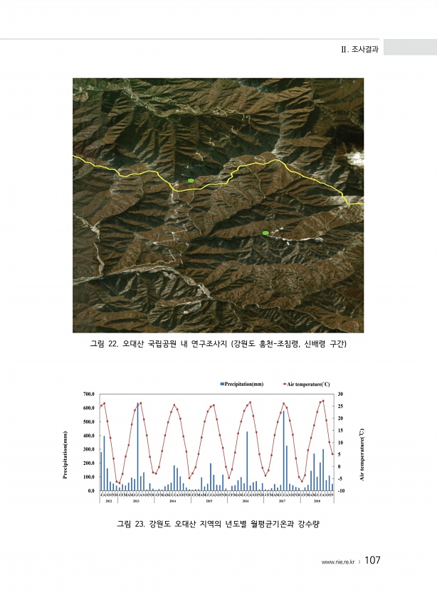 Ⅱ. 조사결과 www.nie.re.kr ? 107 그림 22. 오대산 국립공원 내 연구조사지 강원도 홍천-조침령, 신배령 구간 그림 23. 강원도 오대산 지역의 년도별 월평균기온과강수량