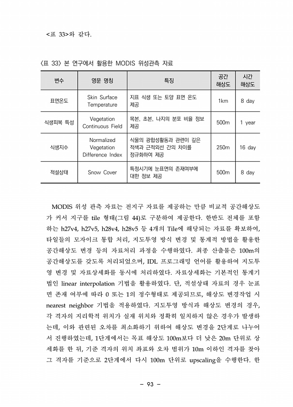 93 표 33 와 같다. 변수 영문 명칭 특징 공간 해상도 시간 해상도 표면온도 Skin Surface Temperature 지표 식생 또는 토양 표면 온도 제공 1km 8 day 식생피복 특성 Vegetation Continuous Field 목본, 초본, 나지의 분포 비율 정보 제공 500m 1 year 식생지수 Normalized Vegetation Difference Index 식물의 광합성활동과 관련이 깊은 적색과 근적외선 간의 차이를 정규화하여 제공 250m 16 day 적설상태 Snow Cover 특정시기에 눈표면의 존재여부에 대한 정보 제공 500m 8 day 표 33 본 연구에서 활용한 MODIS 위성관측 자료 MODIS 위성 관측 자료는 전지구 자료를 제공하는 만큼 비교적 공간해상도 가 커...