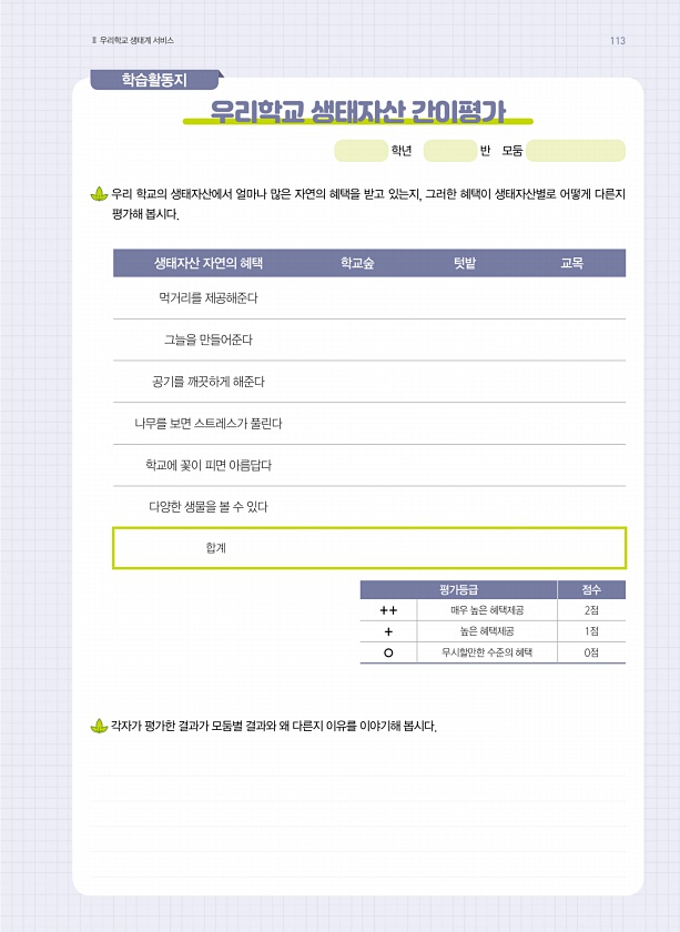 학습활동지 우리학교 생태자산 간이평가 학년 반 모둠 우리 학교의 생태자산에서 얼마나 많은 자연의 혜택을 받고 있는지, 그러한 혜택이 생태자산별로 어떻게 다른지 평가해 봅시다. 생태자산 자연의 혜택 학교숲 텃밭 교목 먹거리를 제공해준다 그늘을 만들어준다 공기를 깨끗하게 해준다 나무를 보면 스트레스가 풀린다 학교에 꽃이 피면 아름답다 다양한 생물을 볼 수 있다 합계 평가등급 점수 ++ 매우 높은 혜택제공 2점 + 높은 혜택제공 1점 ? 무시할만한 수준의 혜택 0점 각자가 평가한 결과가 모둠별 결과와 왜 다른지 이유를 이야기해 봅시다. Ⅱ 우리학교 생태계 서비스113
