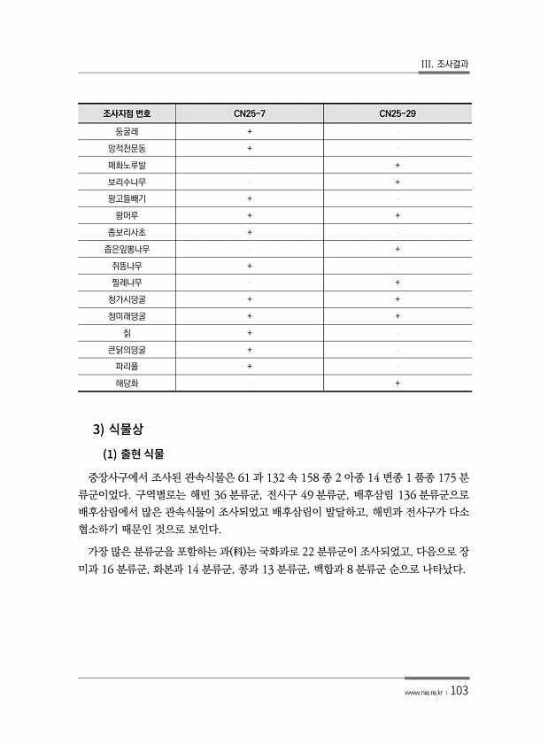 III. 조사결과 www.nie.re.kr ?103 3 1 중장사구에서 조사된 관속식물은 61 과 132 속 158 종 2 아종 14 변종 1 품종 175 분 류군이었다. 구역별로는 해빈 36 분류군, 전사구 49 분류군, 배후삼림 136 분류군으로 배후삼림에서 많은 관속식물이 조사되었고 배후삼림이 발달하고, 해빈과 전사구가 다소 협소하기 때문인 것으로 보인다. 가장 많은 분류군을 포함하는 과 科 는 국화과로 22 분류군이 조사되었고, 다음으로 장 미과 16 분류군, 화본과 14 분류군, 콩과 13 분류군, 백합과 8 분류군 순으로 나타났다. 조사지점 번호 CN25-7 CN25-29 둥굴레 + 망적천문동 + 매화노루발 + 보리수나무 + 왕고들빼기 + 왕머루 + + 좀보리사초 + 좁은잎뽕...