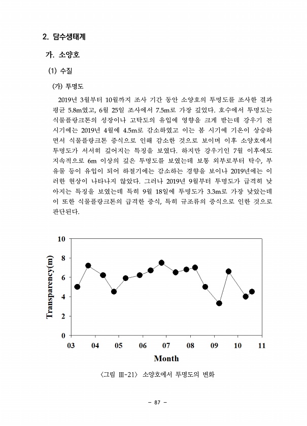 87 2. 담수생태계 가. 소양호 1 수질 가 투명도 2019년 3월부터 10월까지 조사 기간 동안 소양호의 투명도를 조사한 결과 평균 5.8m였고, 6월 25일 조사에서 7.5m로 가장 깊었다. 호수에서 투명도는 식물플랑크톤의 성장이나 고탁도의 유입에 영향을 크게 받는데 강우기 전 시기에는 2019년 4월에 4.5m로 감소하였고 이는 봄 시기에 기온이 상승하 면서 식물플랑크톤 증식으로 인해 감소한 것으로 보이며 이후 소양호에서 투명도가 서서히 깊어지는 특징을 보였다. 하지만 강우기인 7월 이후에도 지속적으로 6m 이상의 깊은 투명도를 보였는데 보통 외부로부터 탁수, 부 유물 등이 유입이 되어 하절기에는 감소하는 경향을 보이나 2019년에는 이 러한 현상이 나타나지 않았다. 그러나 2019년 9월부터 투명도...