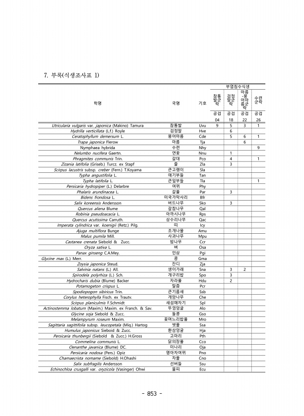 853 7. 부록 식생조사표 1 학명 국명 기호 부엽침수식생 참통 발군 락 검정 말군 락 마름 -붕 어마 름군 락 수련 군락 공검 04 공검 18 공검 22 공검 26 Utricularia vulgaris var. japonica Makino Tamura 참통발 Uvu 9 5 3 1 Hydrilla verticillata L.f. Royle 검정말 Hve 6 Ceratophyllum demersum L. 붕어마름 Cde 5 6 1 Trapa japonica Flerow 마름 Tja 6 Nymphaea hybrida 수련 Nhy 9 Nelumbo nucifera Gaertn. 연꽃 Nnu 1 Phragmites communis Trin. 갈대 Pco 4 1 Zizania latifolia Griseb. Tur...