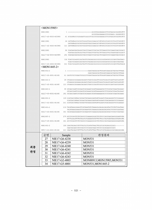 101 MON15985 MON1445-2 최종 판정 순번 Sample 판정결과 27 NIE17-G6-4238 MON531 28 NIE17-G6-4239 MON531 29 NIE17-G6-4240 MON531 30 NIE17-G6-4241 MON531 31 NIE17-G6-4242 MON531 32 NIE17-G6-4243 MON531 33 NIE17-G2-4003 MON88913,MON15985,MON531 34 NIE17-G5-4001MON531,MON1445-2