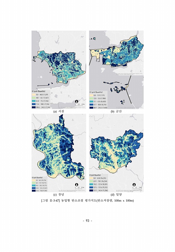 93 a 서천 b 군산 c 창녕 d 밀양 [그림 Ⅱ-3-47] 농업형 탄소조절 평가지도 탄소저장량, 100m x 100m
