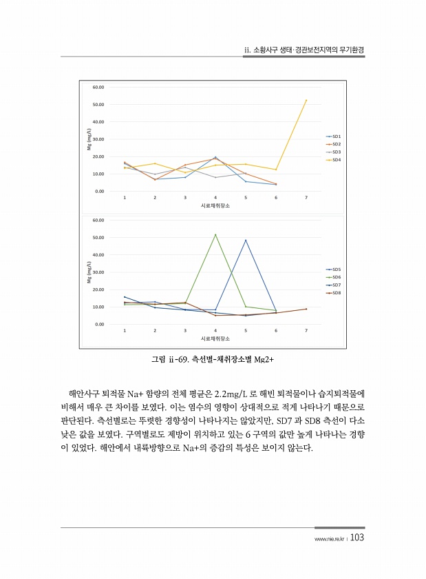 ii. 소황사구 생태·경관보전지역의 무기환경 www.nie.re.kr ?103 그림 ⅱ-69. 측선별-채취장소별 Mg2+ 해안사구 퇴적물 Na+ 함량의 전체 평균은 2.2mg/L 로 해빈 퇴적물이나 습지퇴적물에 비해서 매우 큰 차이를 보였다. 이는 염수의 영향이 상대적으로 적게 나타나기 때문으로 판단된다. 측선별로는 뚜렷한 경향성이 나타나지는 않았지만, SD7 과 SD8 측선이 다소 낮은 값을 보였다. 구역별로도 제방이 위치하고 있는 6 구역의 값만 높게 나타나는 경향 이 있었다. 해안에서 내륙방향으로 Na+의 증감의 특성은 보이지않는다.