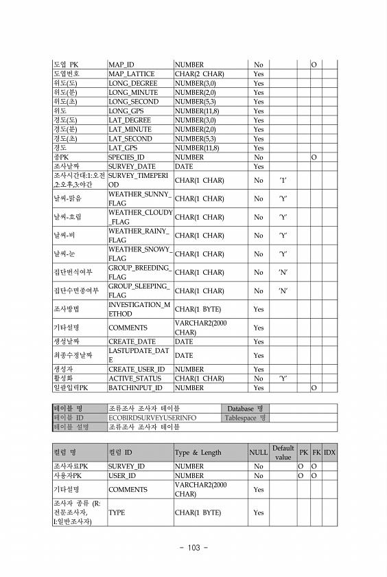 103 도엽 PK MAP_ID NUMBER No O 도엽번호 MAP_LATTICE CHAR 2 CHAR Yes 위도 도 LONG_DEGREE NUMBER 3,0 Yes 위도 분 LONG_MINUTE NUMBER 2,0 Yes 위도 초 LONG_SECOND NUMBER 5,3 Yes 위도 LONG_GPS NUMBER 11,8 Yes 경도 도 LAT_DEGREE NUMBER 3,0 Yes 경도 분 LAT_MINUTE NUMBER 2,0 Yes 경도 초 LAT_SECOND NUMBER 5,3 Yes 경도 LAT_GPS NUMBER 11,8 Yes 종PK SPECIES_ID NUMBER No O 조사날짜 SURVEY_DATE DATE Yes 조사시간대1오전 ,2오후,3야간 SURVEY_TIMEPERI OD CHAR...