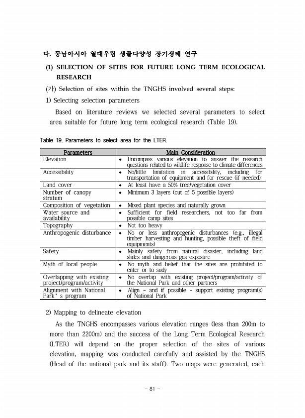 다. 동남아시아 열대우림 생물다양성 장기생태 연구 1 SELECTION OF SITES FOR FUTURE LONG TERM ECOLOGICAL RESEARCH 가 Selection of sites within the TNGHS involved several steps1 Selecting selection parameters Based on literature reviews we selected several parameters to select area suitable for future long term ecological research Table 19 Parameters Main Consideration Elevation ? Encompass various elevation to answer the ...