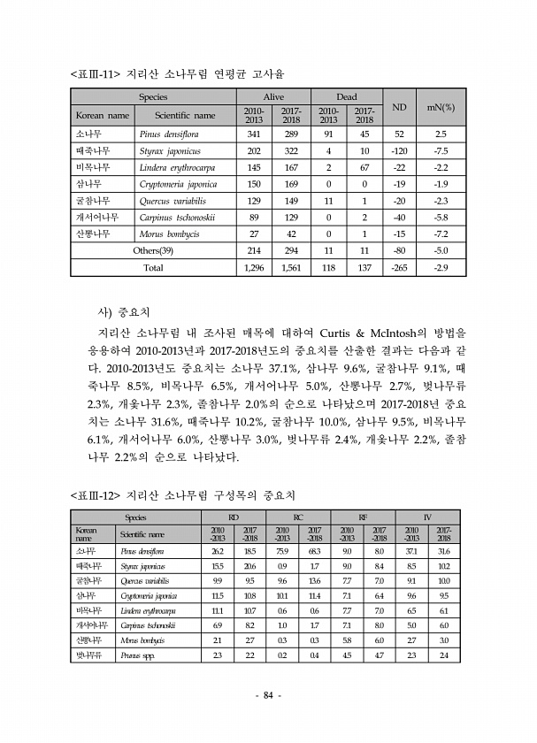 84 Species RD RC RF IV Korean name Scientific name 2010 -2013 2017 -2018 2010 -2013 2017 -2018 2010 -2013 2017 -2018 2010 -2013 2017- 2018 소나무 Pinus densiflora 26.2 18.5 75.9 68.3 9.0 8.0 37.1 31.6 때죽나무 Styrax japonicus 15.5 20.6 0.9 1.7 9.0 8.4 8.5 10.2 굴참나무 Quercus variabilis 9.9 9.5 9.6 13.6 7.7 7.0 9.1 10.0 삼나무 Cryptomeria japonica 11.5 10.8 10.1 11.4 7.1 6.4 9.6 9.5 비목나무 Lindera erythrocarpa ...