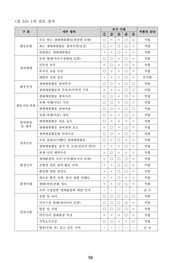 98 표 52 1차 검토 결과 구 분 세부 항목 조사 사례 적합성 진단 ① ② ③ ④ ⑤ 활동유형 주로 하는 생태체험활동 계절별 포함 ○ × × ○ ○ 적합 최근 생태체험활동 참여지역 공간 ○ × ○ ○ × 적합 희망하는 생태체험활동 × × ○ × × 적합 참여형태 동반 형태 가족구성형태 포함 ○ ○ × ○ × 적합 지속성 유무 × ○ × ○ × 적합 목적지 교통 수단 ○ × × ○ × 적합 애완견 동반 유무 × × × ○ × 부적합 활동목적 생태체험활동 참여목적 ○ ○ × ○ ○ 적합 생태체험활동의 주목적/부목적 구분 × × × ○ × 적합 활동시간·비용 생태체험활동 참여시간 ○ ○ × ○ × 적합 전체 여행 이동 시간 ○ ○ × ○ × 적합 생태체험활동 참여비용 ○ ○ × ○ ○ 적합 전체 여행 이동 경...