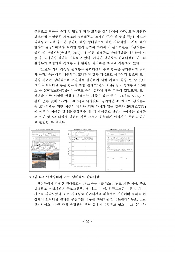 99 부령으로 정하는 주기 및 방법에 따라 조사를 실시하여야 한다. 또한 자연환 경보전법 시행규칙 제28조의 2 생태통로 조사의 주가 및 방법 등 에 따르면 생태통로 조성 후 3년 동안은 해당 생태통로에 대한 지속적인 조사를 해야 한다고 규정되어있다. 이러한 법적 근거에 따라서 각 관리기관은 「생태통로 설치 및 관리지침 환경부, 2010 」에 따른 생태통로 관리대장을 작성하여 시 공 후 모니터링 결과를 기록하고 있다. 기록된 생태통로 관리대장은 연 1회 환경부가 취합하여 생태통로의 현황을 파악하는 자료로 사용하고 있다. ‘14년도 까지 작성된 생태통로 관리대장의 주요 항목은 생태통로의 위치 와 규격, 준공 이후 개선사항, 모니터링 결과 기록으로 이루어져 있으며 모니 터링 결과는 생태통로의 효율성을 판단하기 ...