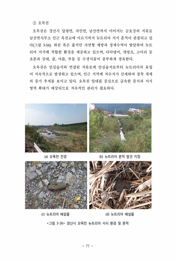 ② 오목천 오목천은 경산시 압량면, 자인면, 남산면까지 이어지는 금호강의 지류로 남산면사무소 인근 옥천교에 이르기까지 뉴트리아 서식 흔적이 관찰되고 있 다 그림 3-16 하천 폭은 좁지만 자연형 제방과 정체수역이 발달하여 뉴트 리아 서식에 적합한 환경을 제공하고 있으며, 다닥냉이, 개망초, 고마리 등 초본과 갈대, 줄, 마름, 부들 등 수생식물이 풍부하게 생육한다. 오목천은 안심습지와 연결된 지류로써 안심습지로부터 뉴트리아의 유입 이 지속적으로 발생하고 있으며, 인근 지역에 저수지가 산재하여 정착 개체 의 증가 추세를 보이고 있다. 오목천 일대를 중심으로 급속한 증식과 서식 영역 확대가 예상되므로 지속적인 관리가 필요하다. ? ? ? ? ? ? ? ? ? ?? ? ??