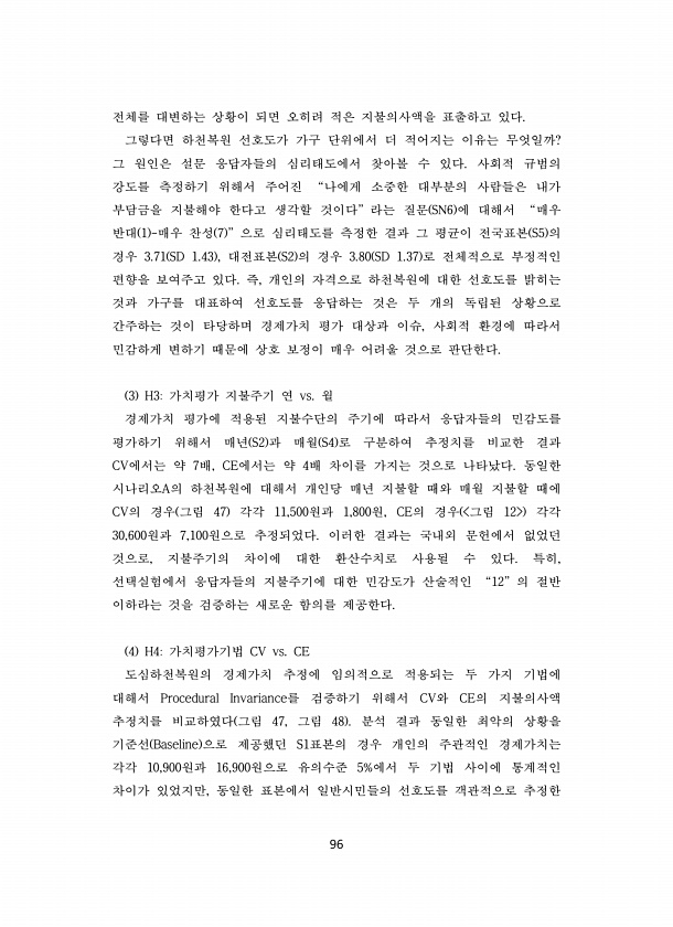 96 전체를 대변하는 상황이 되면 오히려 적은 지불의사액을 표출하고 있다. 그렇다면 하천복원 선호도가 가구 단위에서 더 적어지는 이유는 무엇일까? 그 원인은 설문 응답자들의 심리태도에서 찾아볼 수 있다. 사회적 규범의 강도를 측정하기 위해서 주어진 “나에게 소중한 대부분의 사람들은 내가 부담금을 지불해야 한다고 생각할 것이다” 라는 질문 SN6 에 대해서 “매우 반대 1 -매우 찬성 7 ” 으로 심리태도를 측정한 결과 그 평균이 전국표본 S5 의 경우 3.71 SD 1.43 , 대전표본 S2 의 경우 3.80 SD 1.37 로 전체적으로 부정적인 편향을 보여주고 있다. 즉, 개인의 자격으로 하천복원에 대한 선호도를 밝히는 것과 가구를 대표하여 선호도를 응답하는 것은 두 개의 독립된 상황으로 간주하는 것이 타...