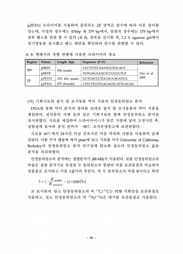 66 pZFXYr 프라이머를 사용하여 증폭되는 ZF 영역은 암수에 따라 다른 길이를 갖는데, 수컷의 경우에는 476bp 와 379 bp에서, 암컷의 경우에는 379 bp에서 증폭 밴드를 관찰 할 수 있다 표 8 증폭을 실시한 후, 1.2 % agarose gel에서 전기영동을 실시했고 밴드 패턴을 확인하여 암수를 판별할 수 있다. Region Primer Length bp Sequence 5’-3’ Reference SRY pSRYF 704 male CCCTTTTCAAATGGTGCAGT Cho et al. 2005 pSRYR TGTGAGAAAGTCCCGGCTGT ZF pZFXYf 379, 476 male 479 female GCTGACCCTGGAGAAGATGA pZFXYr CTTCTTGTTGAGAGTCATT...