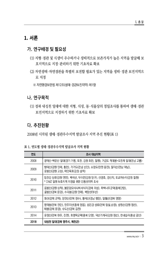 I. 총 괄 www.nie.re.kr ? 3 1. 1 지형·경관 및 식생이 우수하거나 생태적으로 보존가치가 높은 지역을 발굴해 보 호지역으로 지정·관리하기 위한 기초자료 확보 2 자연생태·자연경관을 특별히 보전할 필요가 있는 지역을 생태·경관 보전지역으 로 지정 ※ 자연환경보전법 제12조 생태·경관보전지역 제1항 1 경북 내성천 일대에 대한 지형, 식생, 동·식물상의 정밀조사를 통하여 생태·경관 보전지역으로 지정하기 위한 기초자료 확보 2008년 시작된 생태·경관우수지역 발굴조사 지역 추진 현황 표 1 연도 조사 대상지역 2008 광덕산·백운산 일대 경기 가평, 포천, 강원 화천, 철원 , 거금도 적대봉오천제 일대 전남 고흥 2009 방태산 강원 인제, 홍천 , 가거도 전남 신안 , 소청도 인천 옹진 , 달...