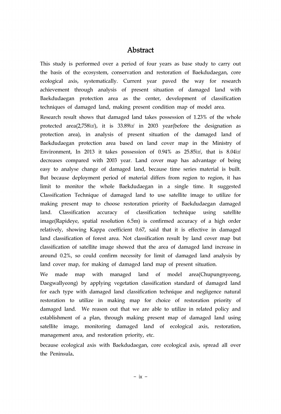 ix Abstract This study is performed over a period of four years as base study to carry out the basis of the ecosystem, conservation and restoration of Baekdudaegan, core ecological axis, systematically. Current year paved the way for research achievement through analysis of present situation of damaged land with Baekdudaegan protection area as the center, development of classification techniques o...