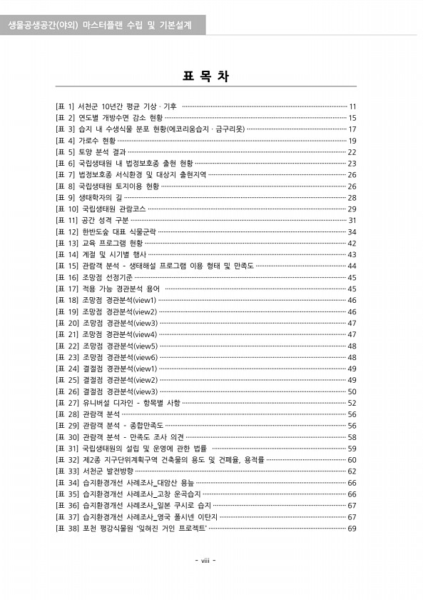 생물공생공간 야외 마스터플랜 수립 및 기본설계 viii 표 목 차 [표 1] 서천군 10년간 평균 기상ㆍ기후 ····························································································· 11 [표 2] 연도별 개방수면 감소 현황 ······································································································ 15 [표 3] 습지 내 수생식물 분포 현황 에코리움습지ㆍ금구리못 ························································ 17 [표 4] 가로수 현황 ········...