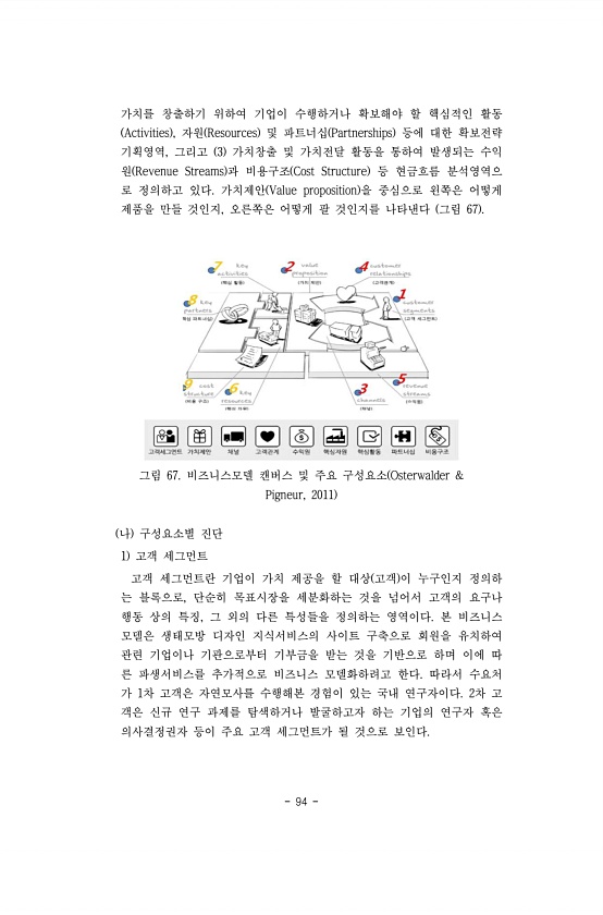 94 가치를 창출하기 위하여 기업이 수행하거나 확보해야 할 핵심적인 활동 Activities , 자원 Resources 및 파트너십 Partnerships 등에 대한 확보전략 기획영역, 그리고 3 가치창출 및 가치전달 활동을 통하여 발생되는 수익 원 Revenue Streams 과 비용구조 Cost Structure 등 현금흐름 분석영역으 로 정의하고 있다. 가치제안 Value proposition 을 중심으로 왼쪽은 어떻게 제품을 만들 것인지, 오른쪽은 어떻게 팔 것인지를 나타낸다 그림 67 그림 67. 비즈니스모델 캔버스 및 주요 구성요소 Osterwalder & Pigneur, 2011 나 구성요소별 진단 1 고객 세그먼트 고객 세그먼트란 기업이 가치 제공을 할 대상 고객 이 누구인지 정의하 는 블록으...