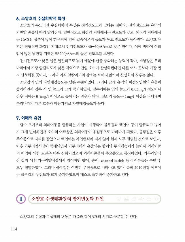 114 6. 소양호의 수질화학적 특성 소양호의 두드러진 수질화학적 특성은 전기전도도가 낮다는 것이다. 전기전도도는 유역의 기반암 종류에 따라 달라진다. 일반적으로 화강암 지대에서는 전도도가 낮고, 퇴적암 지대에서 는 CaCO3 성분이 많이 함유되어 있어 칼슘이온의 농도가 높고 전도도가 높아진다. 소양호 유 역은 전형적인 화강암 지대로서 전기전도도가 40-50μS/cm로 낮은 편이다. 이에 비하여 석회 암이 많은 남한강 지역은 약 200μS/cm의 높은 전도도를 보인다. 전기전도도가 낮은 물은 알칼리도도 낮기 때문에 산을 중화하는 능력이 작다. 소양강은 우리 나라에서 가장 알칼리도가 낮은 지역으로 만일 호수가 산성화된다면 다른 어느 곳보다 가장 먼 저 산성화될 곳이다. 그러나 아직 알칼리도의 감소는 보이지 않...