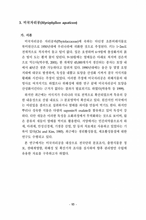 95 3. 미국자리공 Myriophyllum aquaticum 가. 서론 미국자리공은 자리공과 Phytolaccaceae 에 속하는 다년생 초본외래식물로 북미원산으로 1950년대에 우리나라에 귀화한 것으로 추정된다. 키는 12m로 전체적으로 적자색이 돌고 털이 없다. 잎은 호생하며 69월에 총상화서의 붉 은 빛이 도는 흰색 꽃이 달린다. 910월에는 열매들은 아래로 쳐지며 검은색 으로 익는다 박수현, 2001 한 개체당 45,000개가지 생산되는 종자는 토양 내 에서 40년간 생존 가능하다고 알려져 있다. 1990년대에는 울산 등 몇몇 오염 지대에 대규모 발생하여, 독성을 내뿜고 토양을 산성화 시켜서 결국 서식지를 황폐화 시킨다는 주장이 있었다. 이러한 주장에 미국자리공은 위해식물의 대 명사로 여겨지기도 하...