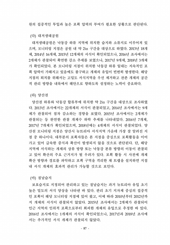 87 원의 집중적인 투입과 높은 포획 압력의 부여가 필요한 상황으로 판단된다. 다 대저생태공원 대저생태공원은 낙동강 하류 지역에 위치한 습지와 소류지로 이루어져 있 으며, 모니터링 지점은 공원 내 약 2㎞ 구간을 대상으로 하였다. 2013년 18개 체, 2014년 16개체, 2015년 12개체의 서식이 확인되었으나, 2016년 조사에서는 2개체가 관찰되어 확연한 감소 추세를 보였으나, 2017년 9개체, 2018년 3개체 가 확인되었다. 본 모니터링 지점이 위치한 낙동강 하류 일대는 지속적인 포 획 압력이 가해지고 있음에도 불구하고 개체의 유입이 빈번히 발생한다. 해당 지점의 퇴치를 위해서는 고밀도 서식지역을 우선 제거하고 잔존 개체의 공간 적 관리 방향을 내륙에서 해안으로 향하도록 설정하는 노력이 중요하다...