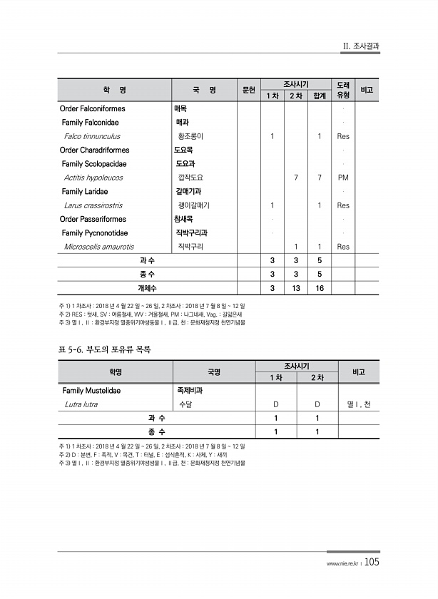 II. 조사결과 www.nie.re.kr ?105 주 1 1 차조사 2018 년 4 월 22 일 26 일, 2 차조사 2018 년 7 월 8 일 12 일 주 2 RES 텃새, SV 여름철새, WV 겨울철새, PM 나그네새, Vag. 길잃은새 주 3 멸Ⅰ, Ⅱ 환경부지정 멸종위기야생동물Ⅰ, Ⅱ급, 천 문화재청지정 천연기념물 학명 국명 조사시기 비고 1 차 2 차 Family Mustelidae 족제비과 Lutra lutra 수달 D D 멸Ⅰ, 천 과 수 1 1 종 수 1 1 표 5-6. 부도의 포유류 목록 주 1 1 차조사 2018 년 4 월 22 일 26 일, 2 차조사 2018 년 7 월 8 일 12 일 주 2 D 분변, F 족적, V 목견, T 터널, E 섭식흔적, K 사체, Y 새끼 주 3 멸Ⅰ, Ⅱ ...