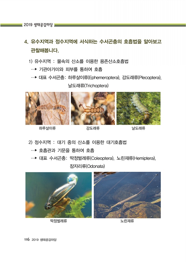 116 2019 생태공감마당 4. 유수지역과 정수지역에 서식하는 수서곤충의 호흡법을 알아보고 관찰해봅니다. 1 유수지역 물속의 산소를 이용한 용존산소호흡법 …? 기관아가미와 피부를 통하여 호흡 …? 대표 수서곤충하루살이류 Ephemeroptera , 강도래류 Plecoptera , 날도래류 Trichoptera 하루살이류 강도래류 날도래류 2 정수지역 대기 중의 산소를 이용한 대기호흡법 …? 호흡관과 기문을 통하여 호흡 …? 대표 수서곤충딱정벌레류 Coleoptera , 노린재류 Hemiptera , 잠자리류 Odonata 딱정벌레류노린재류