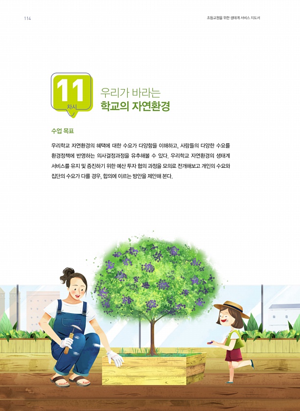 차시 11 수업 목표 우리학교 자연환경의 혜택에 대한 수요가 다양함을 이해하고, 사람들의 다양한 수요를 환경정책에 반영하는 의사결정과정을 유추해볼 수 있다. 우리학교 자연환경의 생태계 서비스를 유지 및 증진하기 위한 예산 투자 협의 과정을 모의로 전개해보고 개인의 수요와 집단의 수요가 다를 경우, 합의에 이르는 방안을 제안해 본다. 우리가 바라는 학교의 자연환경 114 초등교원을 위한 생태계 서비스지도서