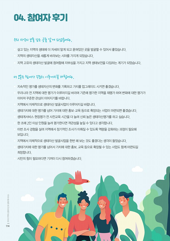 우리 지역의 보물 같은 곳을 알게 되었습니다. ? 살고 있는 지역의 생태에 더 자세히 알게 되고 묻혀있던 곳을 발굴할 수 있어서 좋았습니다. ? 지역의 생태자산을 새롭게 바라보는 시야를 가지게 되었습니다. ? 지역 고유의 생태자산 발굴에 참여함에 자부심을 가지고 지역 생태보전을 다짐하는 계기가 되었습니다. 더 많은 참여가 꾸준히 이루어지길 바랍니다. ? 지속적인 평가를 생태자산의 변화를 기록하고 가치를 업그레이드 시키면 좋겠습니다. ? 우리나라 전 지역에 대한 평가가 이루어지길 바라며 기존에 평가한 지역을 재평가 하여 변화에 대한 평가가 이어져 꾸준한 관심이 이어지기를 바랍니다. ? 지역에서 자제적으로 생태자산 발굴사업이 이루어지길 바랍니다. ? 생태가치에 대한 평가를 넘어 가치에 대한 홍보·교육 등으로 확...