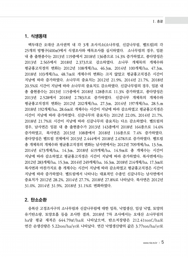 Ⅰ. 총괄 www.nie.re.kr ? 5 1. 식생동태 백두대간 오대산 조사권역 내 각 3개 조사지소 소나무림, 신갈나무림, 벨트림 의 각 25개의 방형구 400㎡ 에서 식생조사와 매목조사를 실시하였다. 소나무림의 경우, 임분 내 총 출현종수는 2013년 119종에서 2018년 136종으로 14.3% 증가하였고, 종다양성은 2013년 2.565에서 2018년 2.373으로 감소하였다. 소나무 개체목의 개체수와 평균흉고직경의 변화는 2012년 108개체/ha, 46.3㎝, 2014년 100개체/ha, 47.3㎝, 2018년 103개체/ha, 48.7㎝로 개체수의 변화는 크지 않았고 평균흉고직경은 시간이 지남에 따라 증가하였다. 소나무의 중요치는 2012년 21.9%, 2014년 21.7%, 2018년 20....