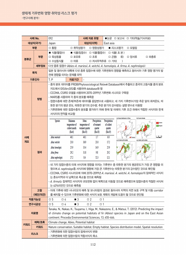 112 생태계 기후변화 영향·취약성·리스크 평가 -연구사례 분석- 사례 No. 092 사례 자료 유형 ■논문 □ 보고서 □ 기타 학술/기사자료 대상지 국가 Japan 대상지 지역 East asia 부문 □ 통합 □ 취약성평가 □ 영향성평가 ■ 리스크평가 □ 모델링 분류군 부문 ■ 식물 활엽수 ■ 식물 침엽수 □ 식물 활엽수 □ 식물 초 본 □ 육상동물 □ 포유류 □ 조류 □ 곤충 류 □ 양서류 □ 파충류 □ 수상동식물 □ 어류 □ 저서무척추류 □ 기타 세부정보 다섯 종류 침엽수 Abies-A. mariesii, A. veitchii, A. homolepis, A. firma, A. nephrolepis 목적 일본 및 동아시아 대륙에 다섯 종류 침엽수에 대한 기후변화의 영향을 예측하고 동아시아 기후 영향 평가...