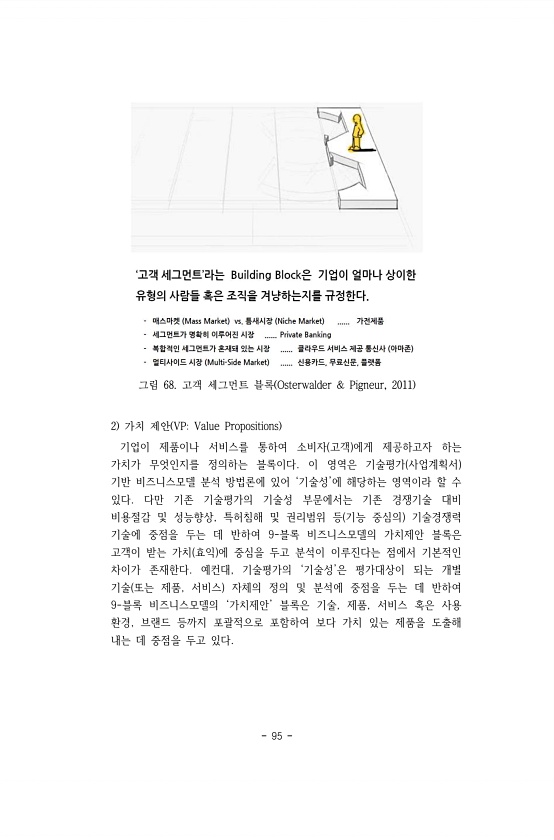 95 그림 68. 고객 세그먼트 블록 Osterwalder & Pigneur, 2011 2 가치 제안 VPValue Propositions 기업이 제품이나 서비스를 통하여 소비자 고객 에게 제공하고자 하는 가치가 무엇인지를 정의하는 블록이다. 이 영역은 기술평가 사업계획서 기반 비즈니스모델 분석 방법론에 있어 ‘기술성’에 해당하는 영역이라 할 수 있다. 다만 기존 기술평가의 기술성 부문에서는 기존 경쟁기술 대비 비용절감 및 성능향상, 특허침해 및 권리범위 등 기능 중심의 기술경쟁력 기술에 중점을 두는 데 반하여 9-블록 비즈니스모델의 가치제안 블록은 고객이 받는 가치 효익 에 중심을 두고 분석이 이루진다는 점에서 기본적인 차이가 존재한다. 예컨대, 기술평가의 ‘기술성’은 평가대상이 되는 개별 기술 또는 제품...
