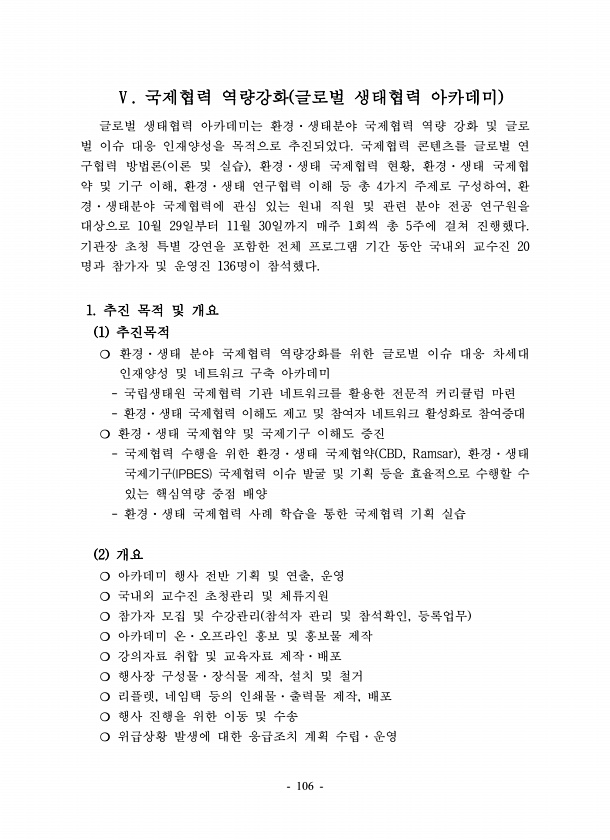 106 Ⅴ. 국제협력 역량강화 글로벌 생태협력 아카데미 글로벌 생태협력 아카데미는 환경·생태분야 국제협력 역량 강화 및 글로 벌 이슈 대응 인재양성을 목적으로 추진되었다. 국제협력 콘텐츠를 글로벌 연 구협력 방법론 이론 및 실습 , 환경·생태 국제협력 현황, 환경·생태 국제협 약 및 기구 이해, 환경·생태 연구협력 이해 등 총 4가지 주제로 구성하여, 환 경·생태분야 국제협력에 관심 있는 원내 직원 및 관련 분야 전공 연구원을 대상으로 10월 29일부터 11월 30일까지 매주 1회씩 총 5주에 걸쳐 진행했다. 기관장 초청 특별 강연을 포함한 전체 프로그램 기간 동안 국내외 교수진 20 명과 참가자 및 운영진 136명이 참석했다. 1. 추진 목적 및 개요 1 추진목적 ? 환경·생태 분야 국제협력 역량강화를 위...